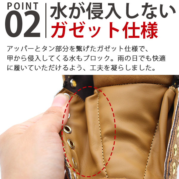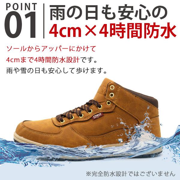 接地面から4cm×4時間防水なので、雨でも快適です。また、靴内部には防水シートを使用しているので水が侵入しにくく、快適に歩けます。