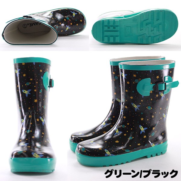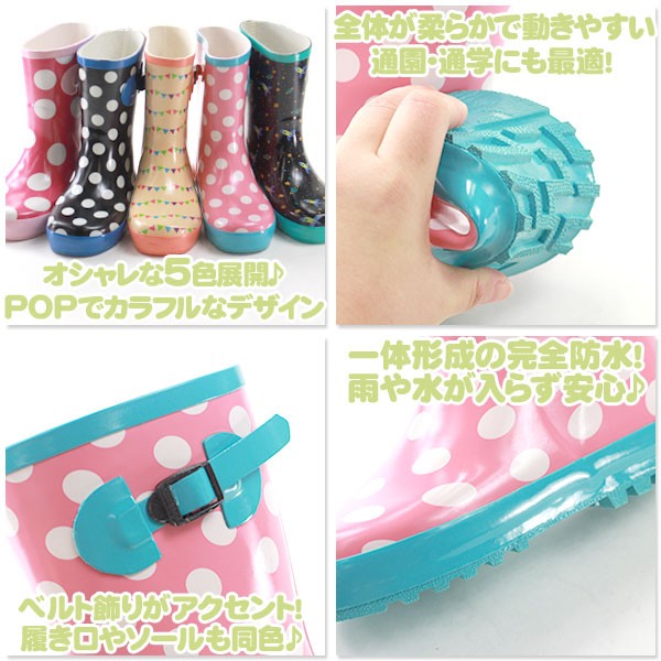 長靴 ミドル 子供 キッズ ジュニア かわいい 宇宙 旗 ドット 水玉 カラフル ベルト飾り 一体成型 完全防水 雨 おしゃれ 女の子 雪 オールシーズン