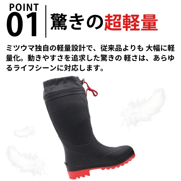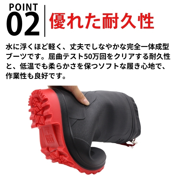 水に浮くほど軽く、丈夫でしなやかな完全一体成型ブーツです。屈曲テスト50万回をクリアする耐久性と、低温でも柔らかさを保つソフトな履き心地で、作業性も良好です。