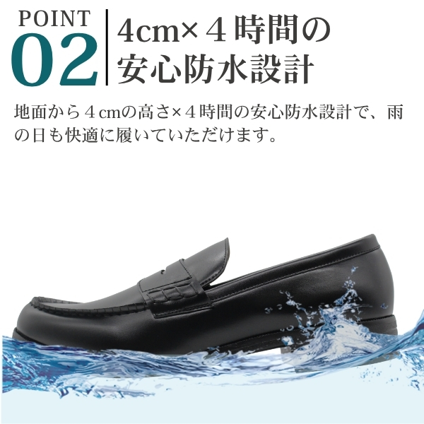 地面から4cm、4時間の安心防水設計で雨の日も快適に履いていただけます。