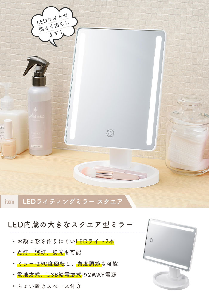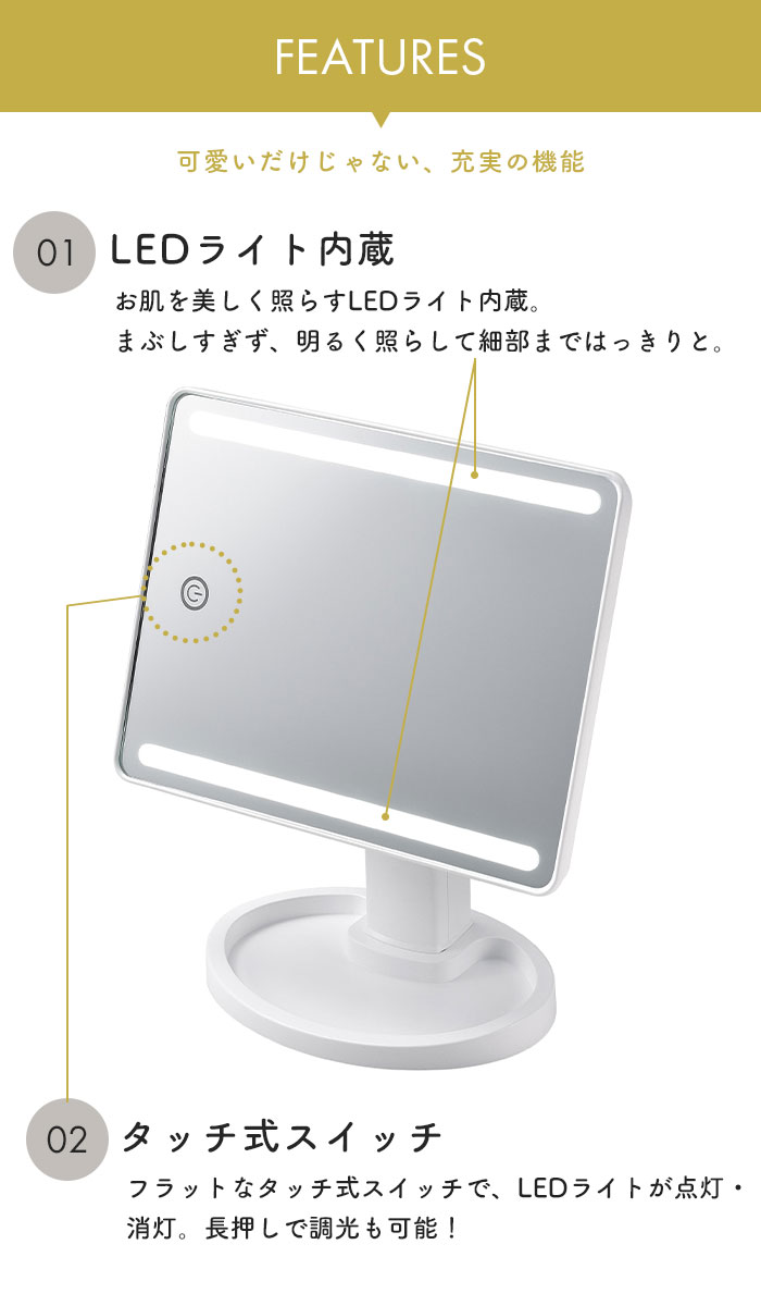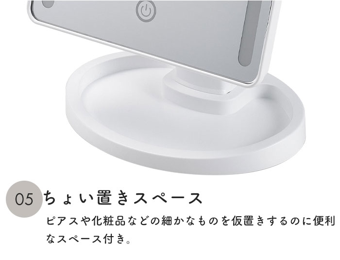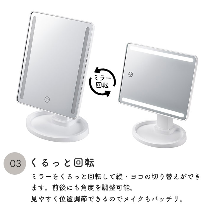 | LEDライト内蔵で細部まで明るく照らすLEDライティングミラーです。 ミラーの左右サイドには、眩しすぎなく、お肌を美しく照らすLEDライトが内臓。 タッチ式のスイッチでLEDライトの点灯・消灯ができ、長押しすれば調光可能! ピアスや化粧品など細かいものを仮置きできる便利スペース付き。 くるっと回転して縦・横の切り替えができます。 前後にも角度を調整可能。 見やすい位置で調整できてメイクもバッチリです。 |