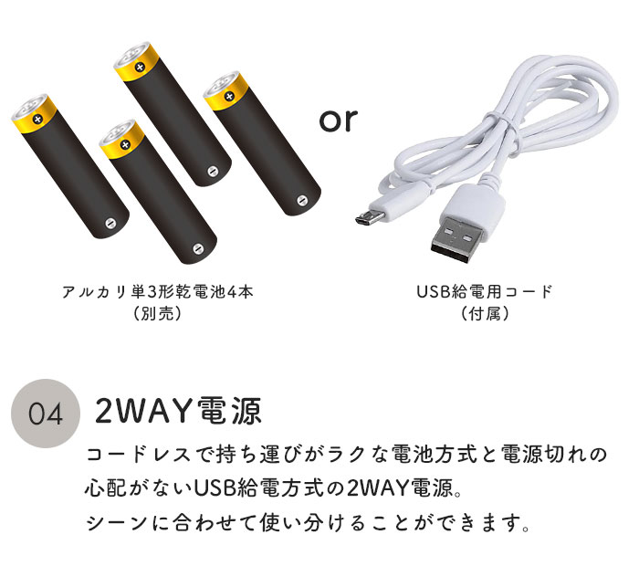 | ◇電源は、2WAY 1、コードレスで持ち運びも楽々な電池方式 2、電池切れの心配がないUSB給電方式 |