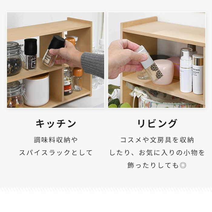 | キッチン周りやカウンターに置いて使える木製ラック。 調味料やスパイスを整理できるスパイスラックとして便利。 奥行約15cmのゆったり設計で、CDや小物をディスプレイしながら収納可能。 コスメや文房具を収納したり、お気に入りの小物を飾ってインテリアとして楽しめるデザインです。 シンプルでナチュラルテイストのため、キッチン・リビング・デスク周りなど様々な場所で使いやすい仕様。 サイズ違いのオープンラックと並べて使えば、統一感のあるおしゃれな収納スペースを演出。 |