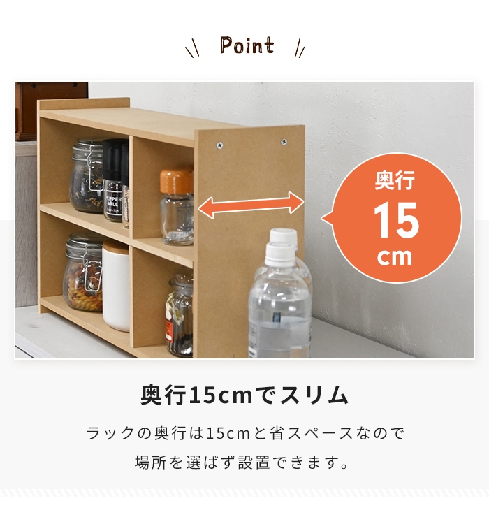 | ・ナチュラルな木製オープンラック ・調味料やスパイスの収納に便利 ・コスメや文房具、小物の収納にも対応 ・奥行約15cmでディスプレイ収納が可能 ・キッチンやデスクなど様々な場所で使えるシンプルデザイン ・サイズ違いと組み合わせておしゃれに使用可能 |
