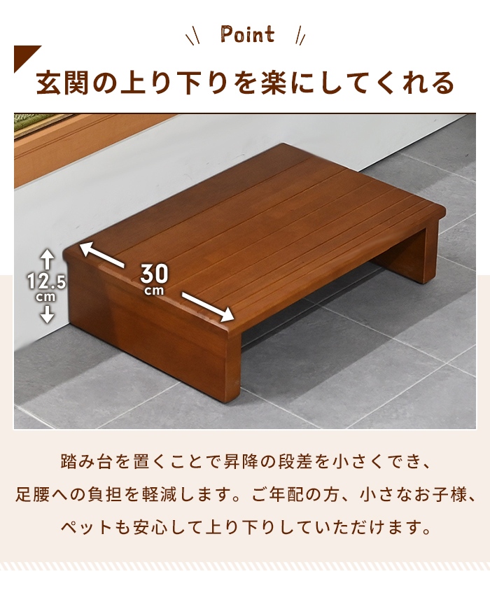 | ・玄関の段差を小さくし、足腰の負担を和らげる玄関台 ・踏み台表面は滑りにくい溝加工 ・靴を最大2足収納できる収納スペース付き ・ガタつきを防ぐアジャスター付き脚部 ・コーナーで2台組み合わせて設置可能 ・玄関に馴染む天然木デザイン |