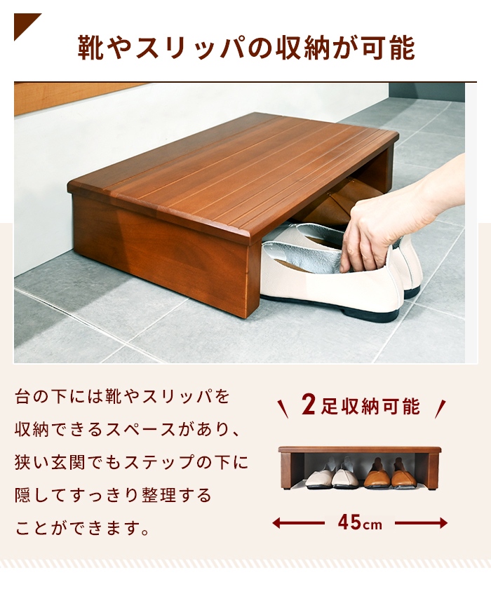 | 玄関の段差を小さくし、昇り降りの負担をやわらげる玄関踏み台。 天然木の風合いが玄関を落ち着いた雰囲気に演出。 表面には溝加工を施し、滑りにくい安心設計。 踏み台下には靴を最大2足収納でき、玄関スペースを有効活用。 脚部にはガタつきを防ぐアジャスター付きで勾配のある玄関でも水平に設置できます。 コーナー部分に2台を組み合わせて使用するレイアウトも可能。 |