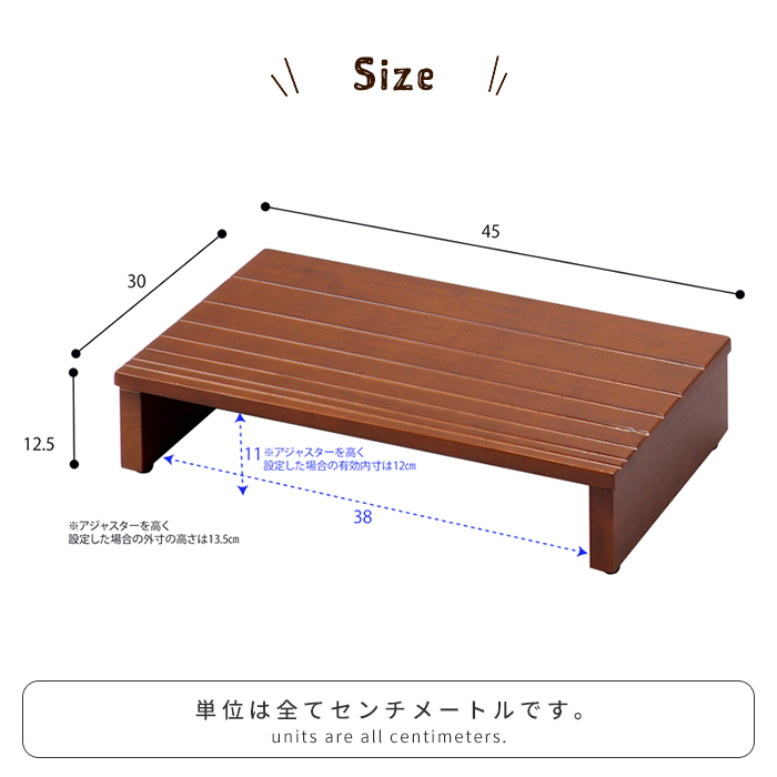 | 幅45×奥行30×高さ12.5cm (※アジャスターを高く設定した時の高さ:13.5cm) |