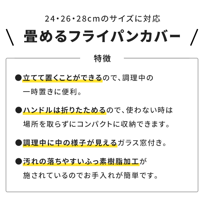 | ・3サイズ兼用(24・26・28cm) ・取っ手がたためるので収納に便利 ・調理中の料理が見えるガラス窓 ・フライパンのハンドルにぶつからない形状 ・汚れが落ちやすいフッ素樹脂加工 |