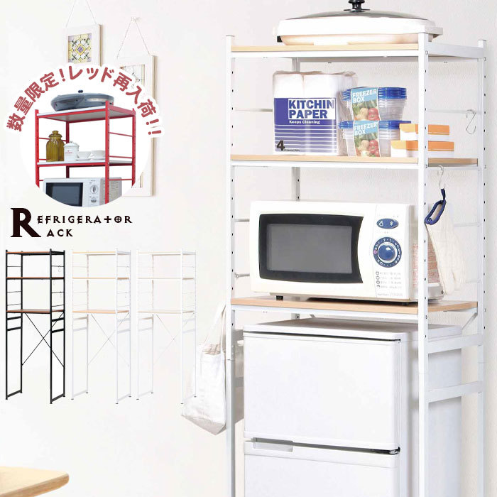 | 冷蔵庫上のデッドスペースに収納場所を確保し、無駄のないキッチンスペースを。 棚板3段の豊富な収納力で、キッチン家電やキッチン用品をひとまとめ。 収納するモノに合わせて棚板の高さを5cmピッチで調節できます。 レジ袋収納やミトンなどを引っ掛けて収納するのに便利なS字フック3個付き。 清潔感漂う北欧テイストなホワイトフレーム×ナチュラルとスタイリッシュなミッドセンチュリーテイストのブラックフレーム×ブラウン、当店限定カラー、ホワイトフレーム×ホワイト、レッドフレーム×ホワイトが再登場。 |