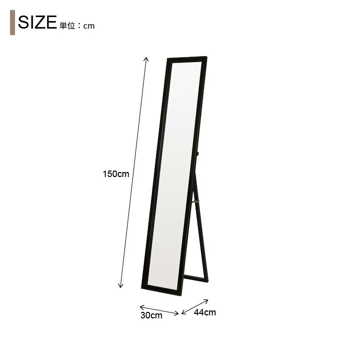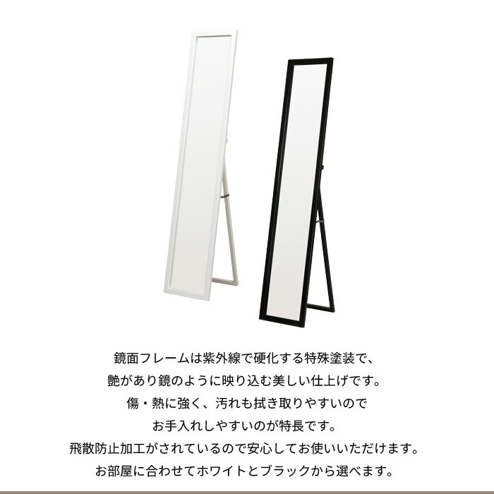 | 美しい鏡面加工フレームの幅30cmのスタンドミラー。 紫外線で硬化する特殊塗装で、ツヤがあり鏡のように映りこむ美しい仕上げです。 キズや熱に強く、汚れてもサッと拭きとりやすく、お手入れもラクラク。 ミラーは飛散防止加工が施されているので、万が一強い衝撃が加わったとしても破片が飛び散らないので安心です。 使わない時は折りたたんで家具のすき間などに収納できるので邪魔になりません。 お部屋のテイストや好みに合わせて選べるホワイトとブラックの2カラー。 |