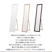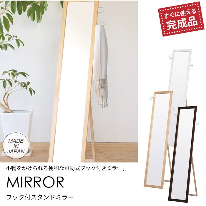 職人が丁寧に製造したこだわりの日本製。可動式フック付スタンドミラー。2小物を掛けられる便利なフック付のミラーです。高さは5段階に付け替えができます。掛けたものが滑りにくい滑り止め付。天然木フレームは優しい雰囲気で飽きずに長くお使いいただけます。ミラーは飛散防止加工が施されているので、万が一強い衝撃が加わったとしても破片が飛び散らないので安心です。使わない時は折りたたんで家具のすき間などに収納できるので邪魔になりません。どんなお部屋にも馴染むブラウンカラー。