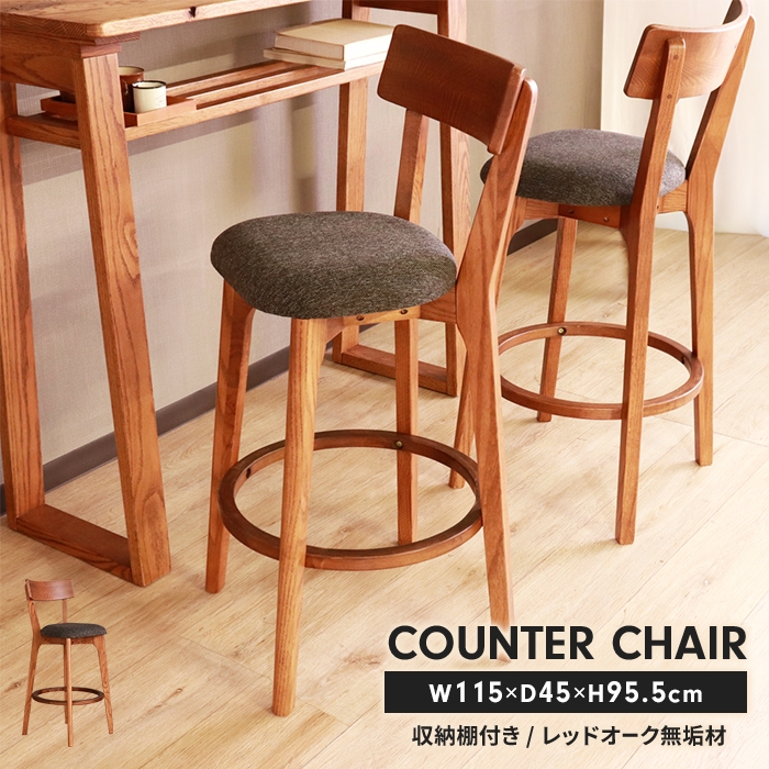 | レッドオーク無垢材を贅沢に使用したカウンターチェア。 温もりを感じる天然木がお部屋に優しい印象を与えてくれます。 天然木ならではの木目と節は同じものが一つとしてありません。 チェアには足置きがついているので、足を置いてリラックスすることができます。 |