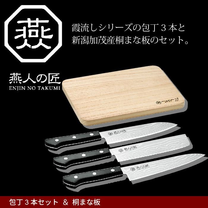 | ● 燕人の匠 ● 三徳包丁170mm&桐まな板 ● 三徳包丁170mm&桐まな板&ボウル18セット ● 包丁3本セット&桐まな板 ※このページは[包丁3本セット&桐まな板]を販売しております。 | |