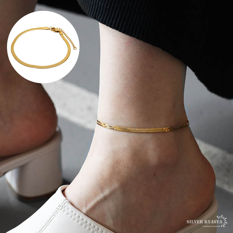 スネークチェーンを使用したチェーンアンクレット。シンプルなデザインながらも存在感があり着用するだけで華やかな印象に。