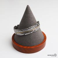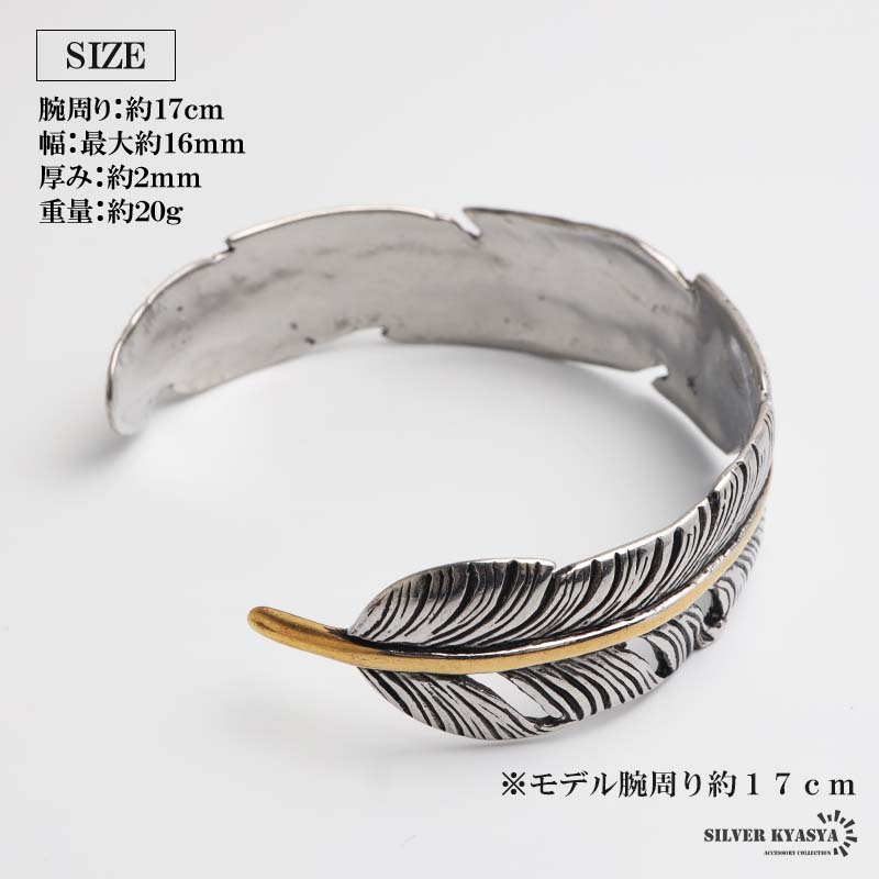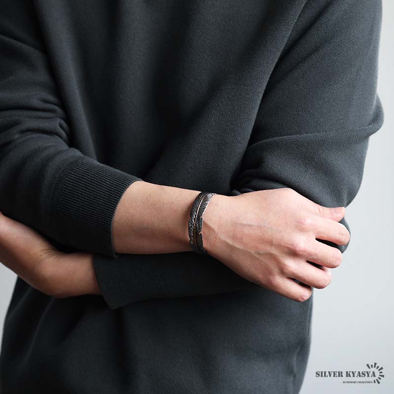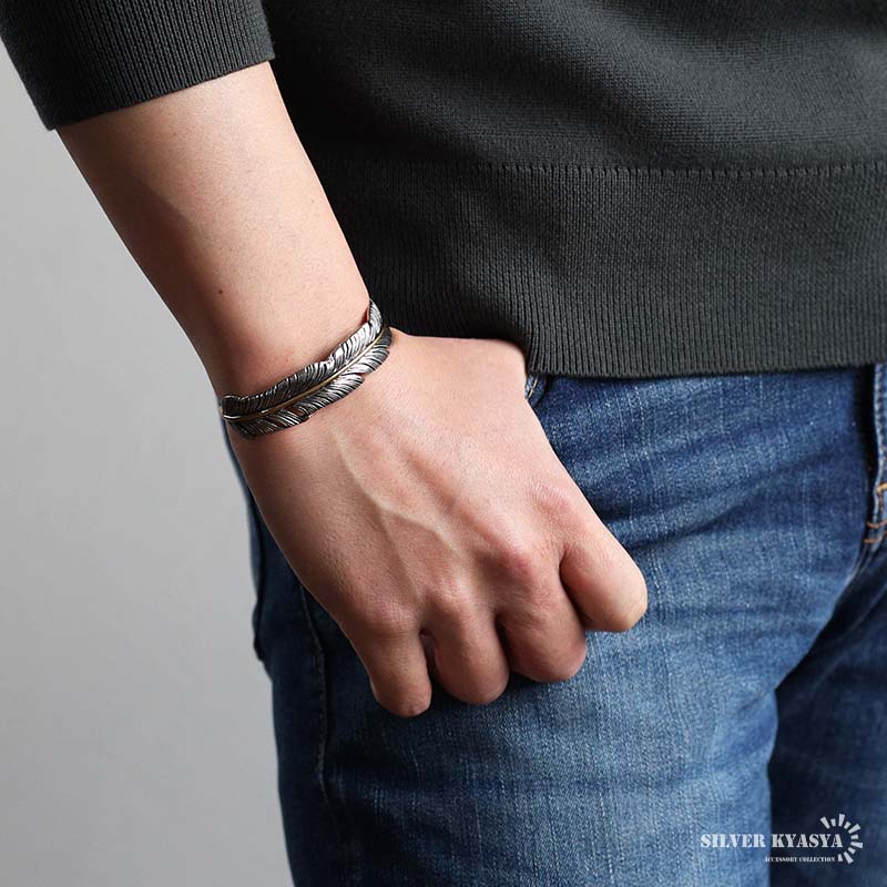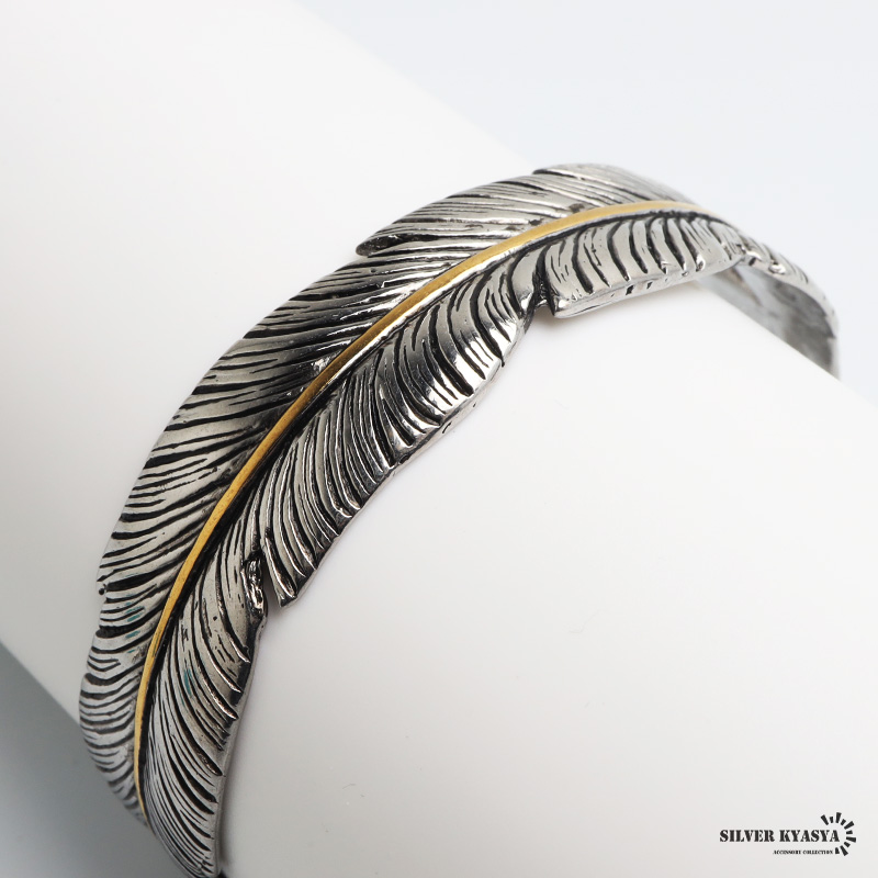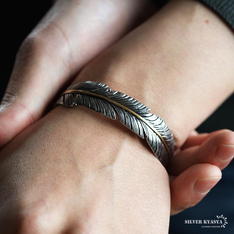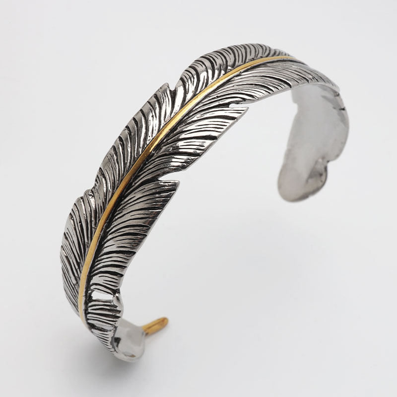 いぶし銀にゴールドラインが映えるネイティブ風フェザーバングル。丁寧に彫り込まれた羽根の毛並みが、緻密で繊細な美しさを演出します。ステンレス製のため、水や汗にも強く、つけっぱなしでも安心。まるで本物の羽根が手首を包み込み、装いに個性を添えてくれます。