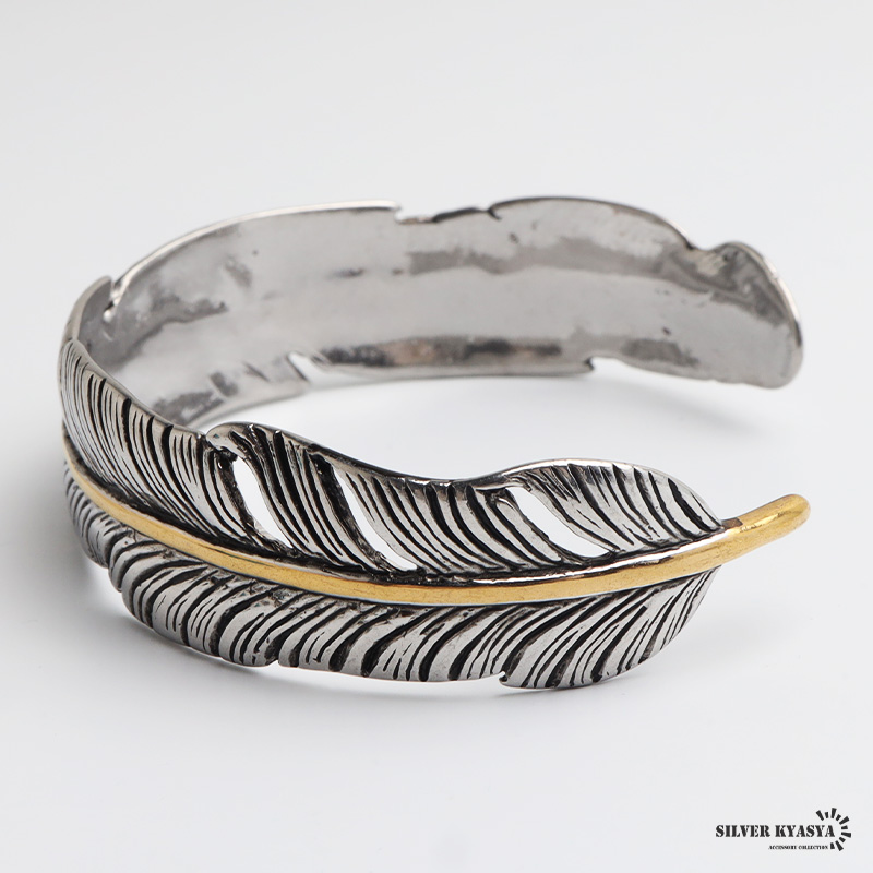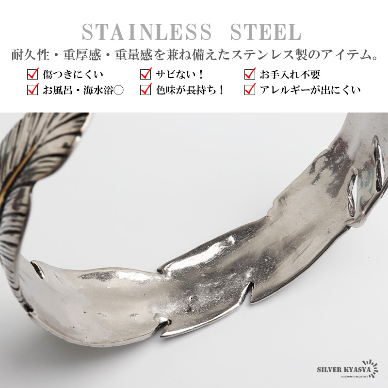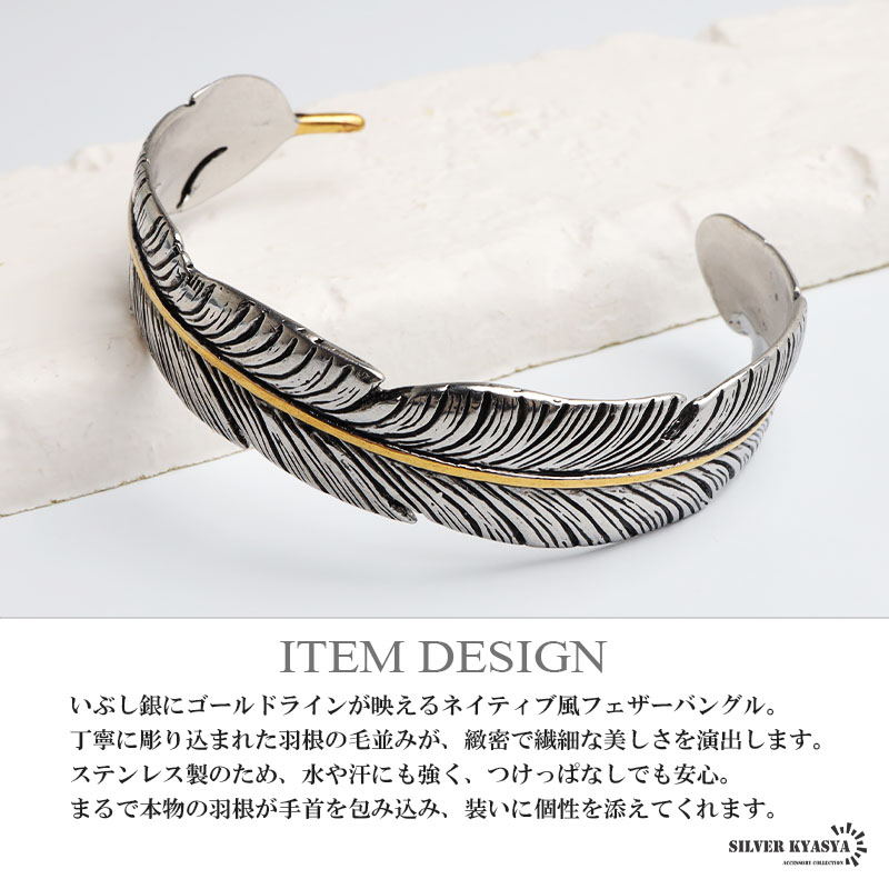 ステンレス フェザーバングル 羽根 インディアンジュエリー シンプルバングル ゴールドライン シルバー メンズ 金属アレルギー対応