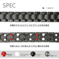 ■高品質ステンレスを使用したリンクブレスレットつや消し加工とのコントラストがお洒落なシックなブラックデザインタイプの磁気ブレスマッドなスタイルがどんなファッションにも取り入れやすいおすすめのアイテムです。幅18ミリの太幅デザインです。■内側にはダブルビーズが並ぶ隠れたデザインが魅力です。■ビーズの種類ホワイト:マイナスイオンビーズブラック:ヘマタイトビーズシルバー:磁気ビーズレッド:遠赤外線ビーズ■サビや劣化、変色に強いステンレス素材を使用海などのレジャーにおすすめのアイテム!メッキも剥がれにくく、つけっぱなしも可能です。サイズを変えられる調整器具アイテム付属!自分サイズへの変更が可能です!