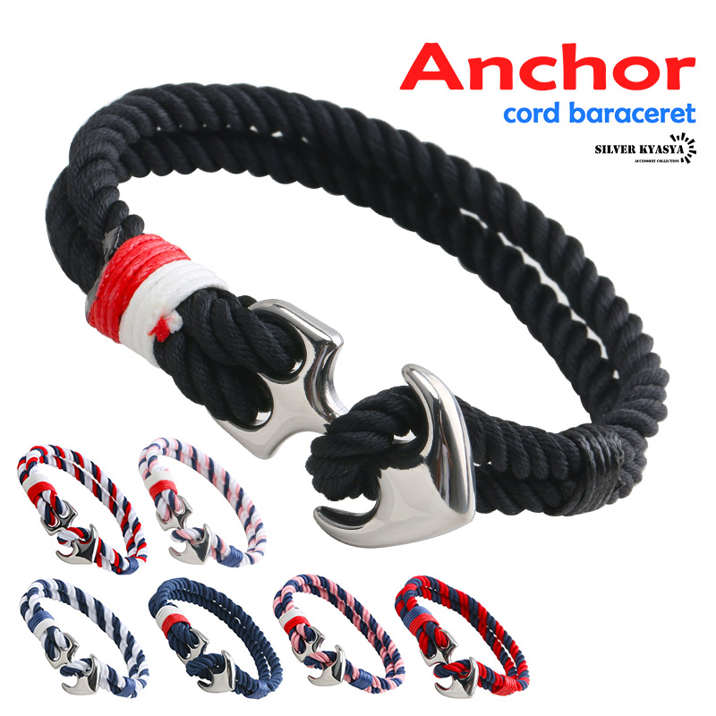 コードブレスレット 紐 アンカー 碇 錨 いかり カラフル ボーダー ストライプ シルバー ブラック 全7タイプ お揃い ペア リストバンド