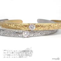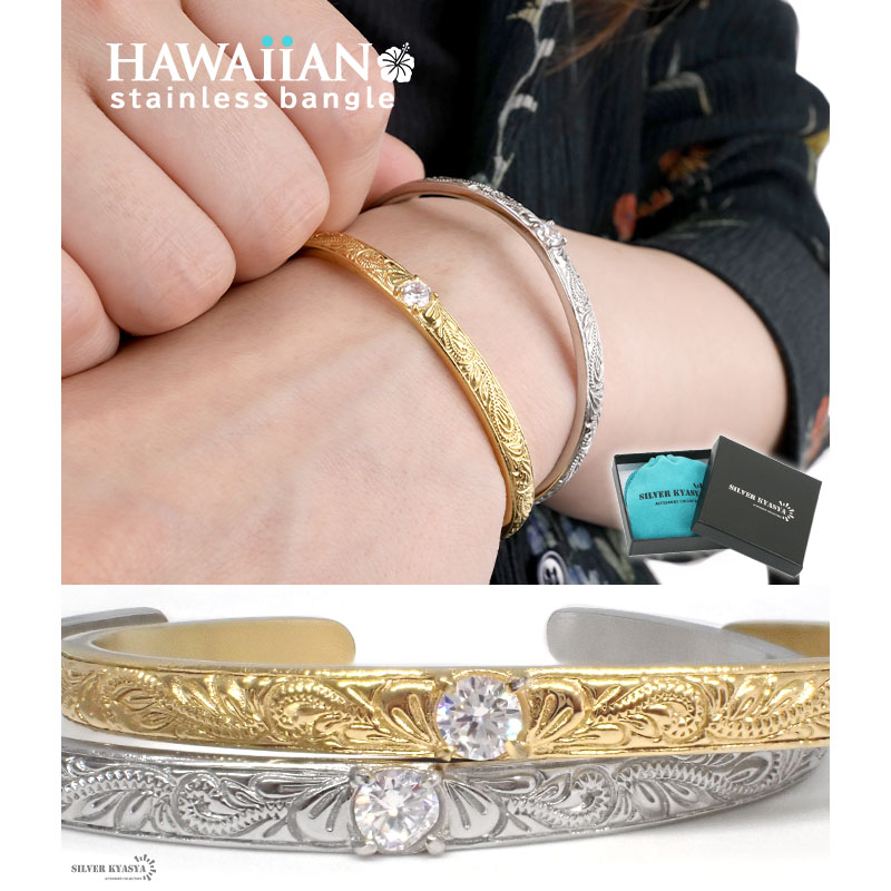 ハワイアンジュエリー バングル シルバー ゴールド CZ AAA 18k IPメッキ ステンレス マイレ スクロール 波 ハワイ 平打 専用BOX付属 爆買