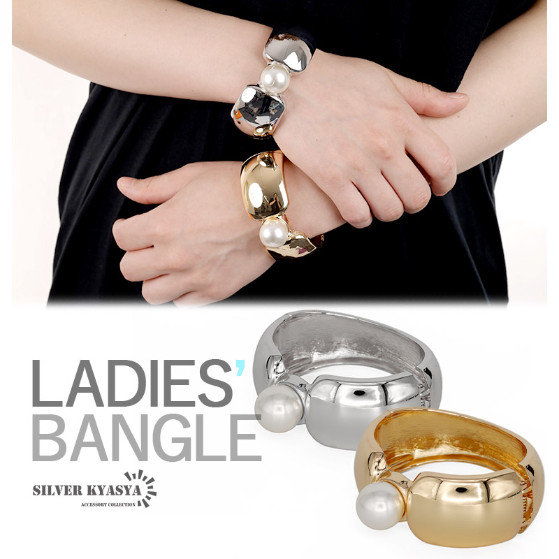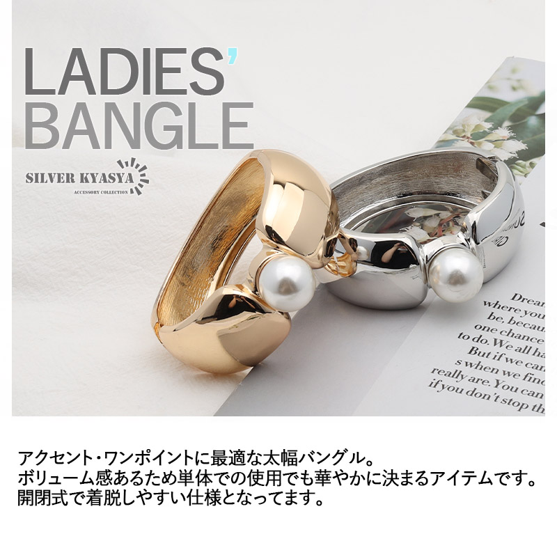 ワンポイント パールバングル ワイドバングル ぷっくり 幅広 太めバングル 大ぶり ゴールド 開閉式 カジュアルバングル 腕輪 レディース