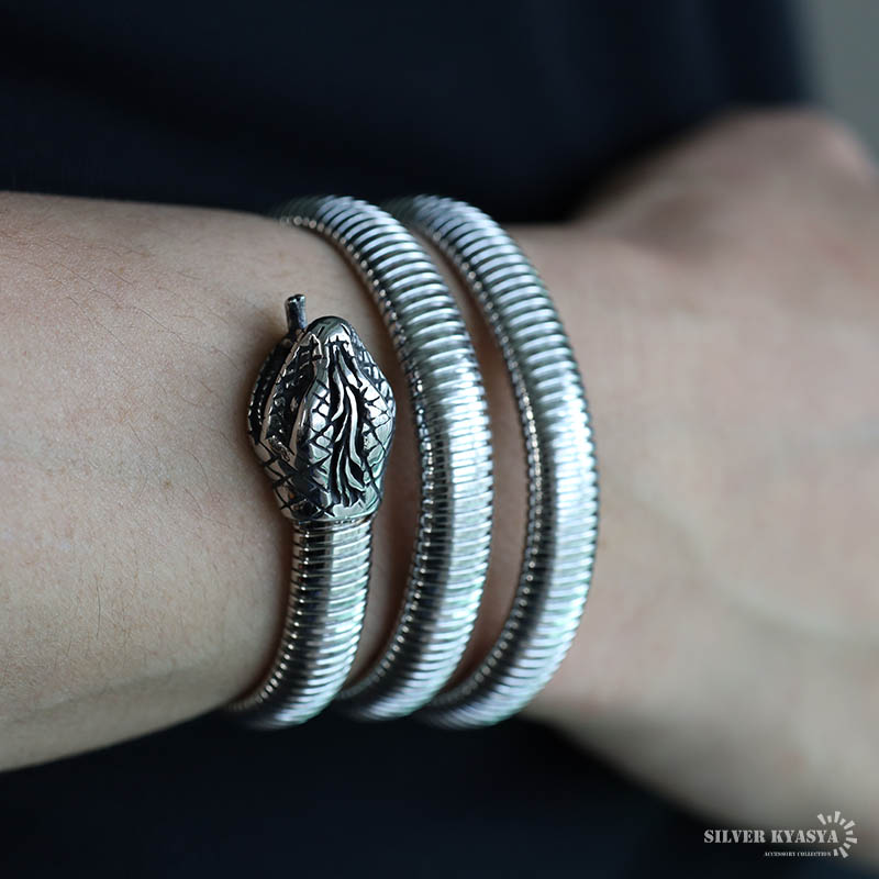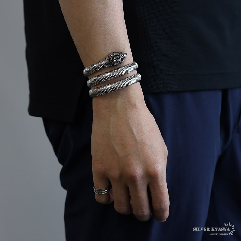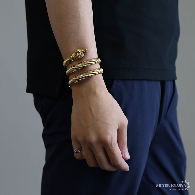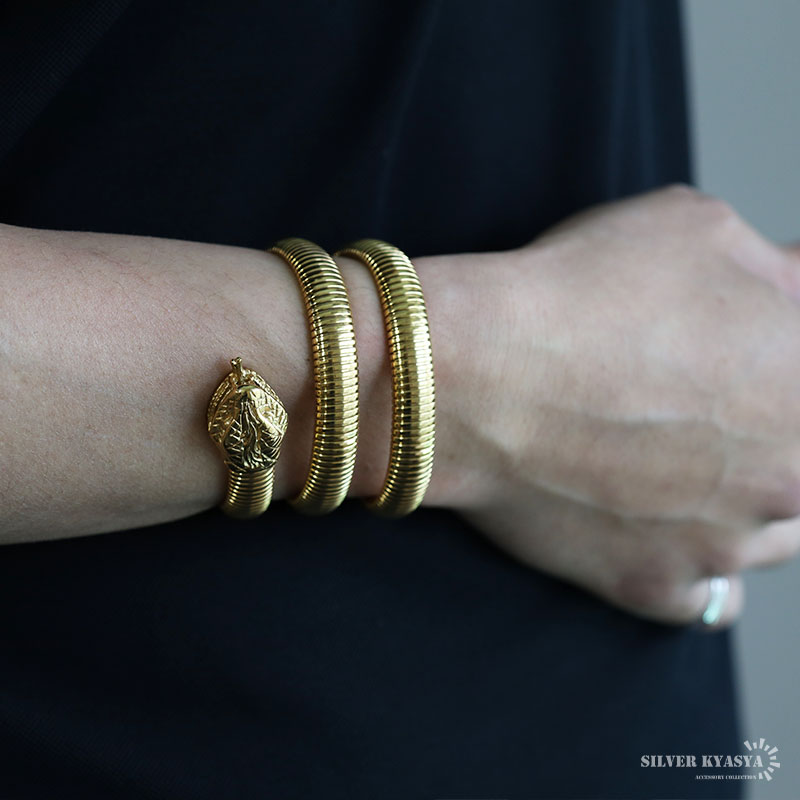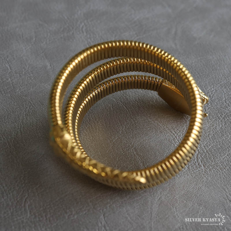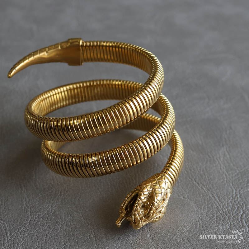 細部まで繊細に表現された蛇をモチーフにしたバングル。巻き付いた見た目はインパクトを与えてくれます。