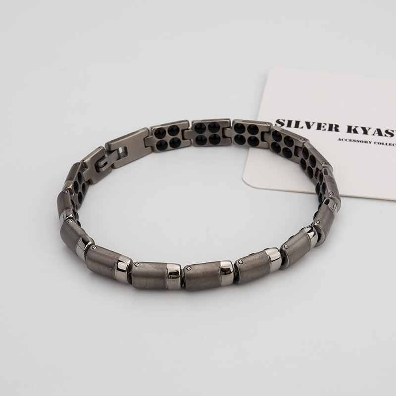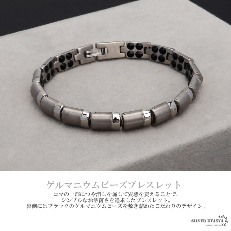 コマの一部につや消しを施して質感を変えることで、シンプルなお洒落を追求したブレスレット。裏側にはブラックのゲルマニウムビーズを敷き詰めたこだわりのデザイン。