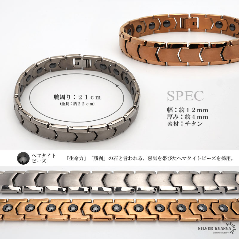 コマの一部につや消しを施したシンプルな細身磁気ブレスレット。裏側にはブラックのヘマタイトビーズがさり気なく並ぶお洒落なアイテム。