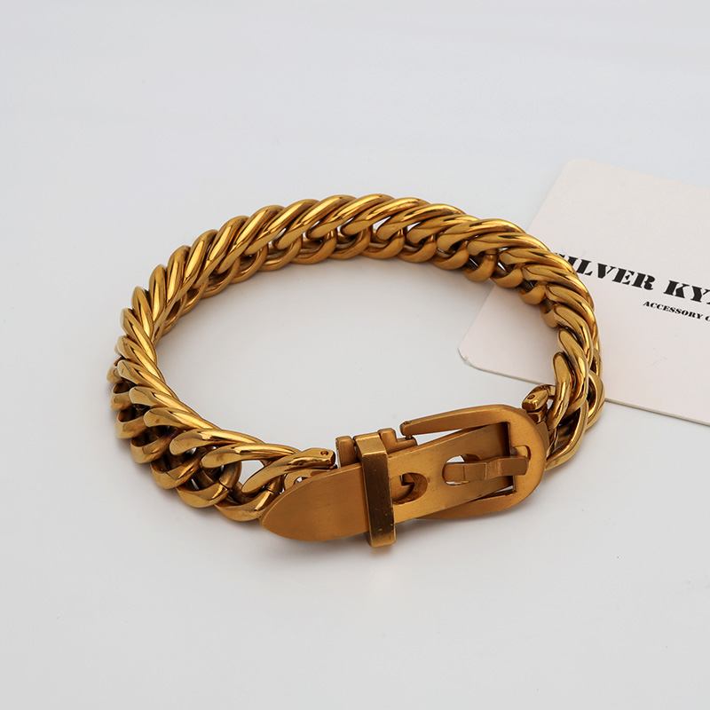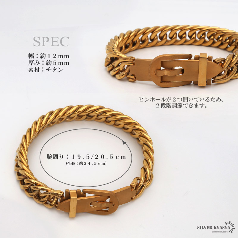 ベルトデザインのバックルと密度の高いダブル喜平チェーンが迫力と重厚感を生み出すデザイン。裏側にはブラックのゲルマニウムビーズがさり気なく並ぶお洒落なアイテム。