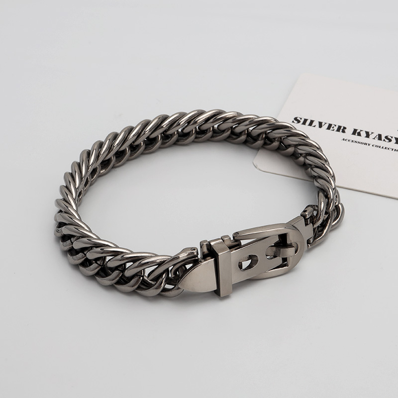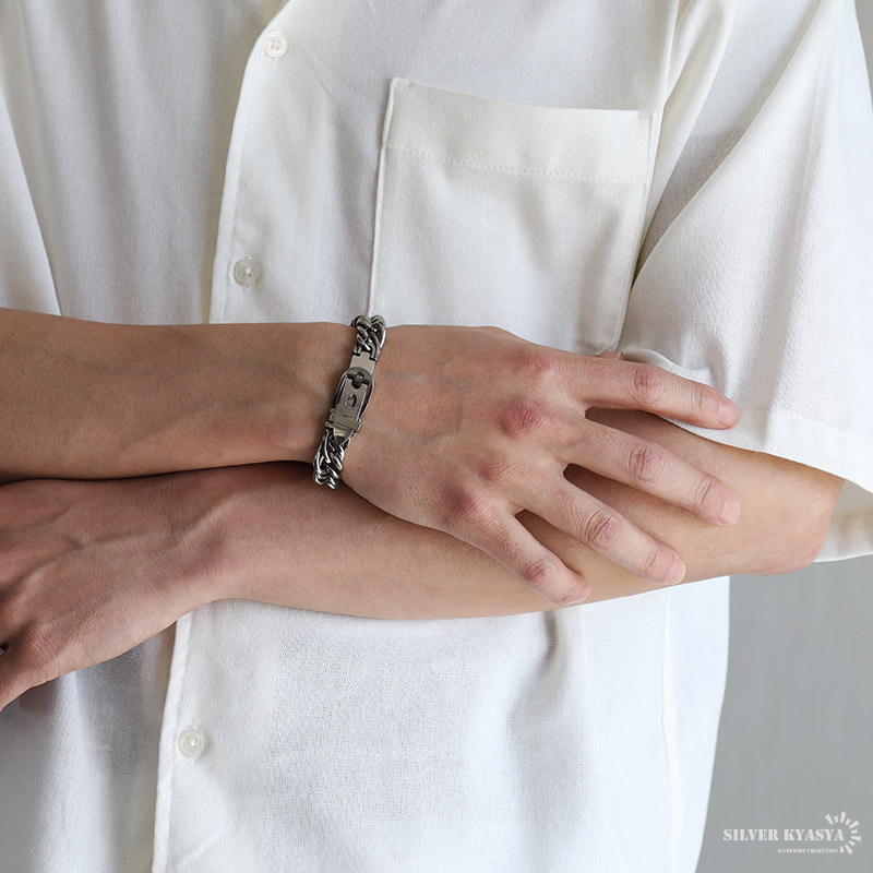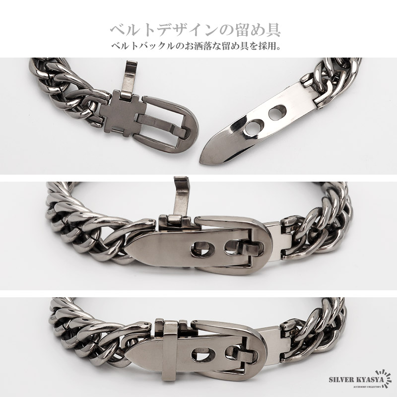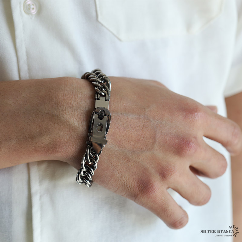 ベルトデザインのバックルが目を引くお洒落なブレスレット。密度の高いダブル喜平チェーンが迫力と重厚感を生み出すデザイン。