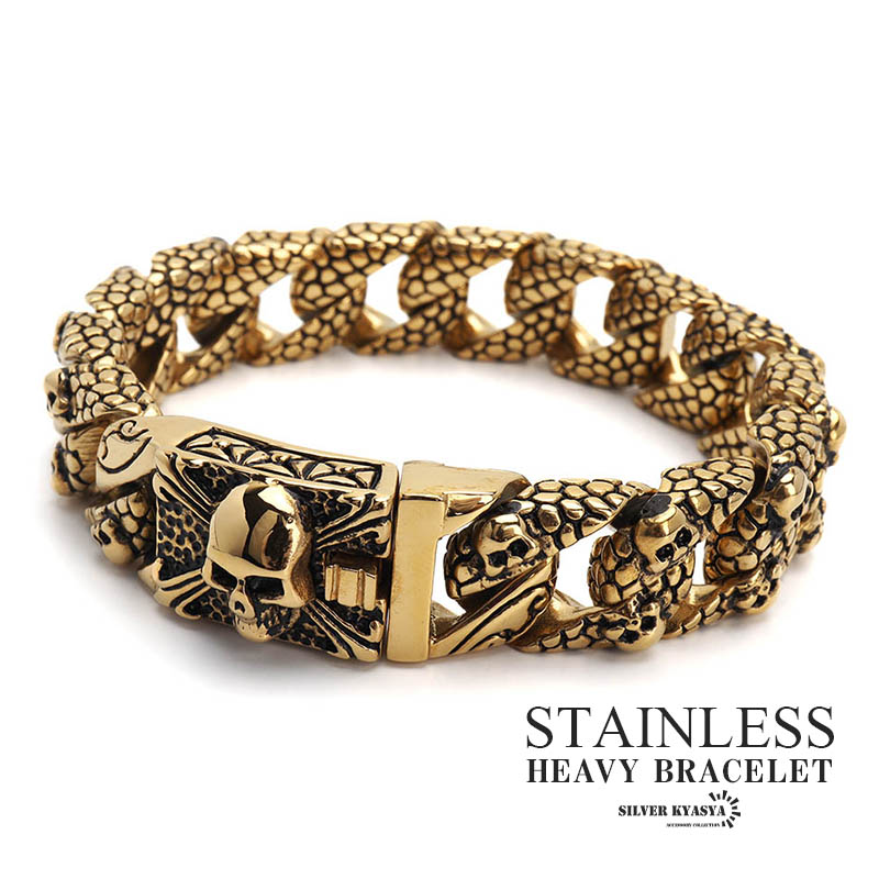 重厚 チェーンブレスレット スカル 喜平チェーン ゴールド 金 ごつめ ステンレス 316L 喜平ブレスレット ワイドブレスレット