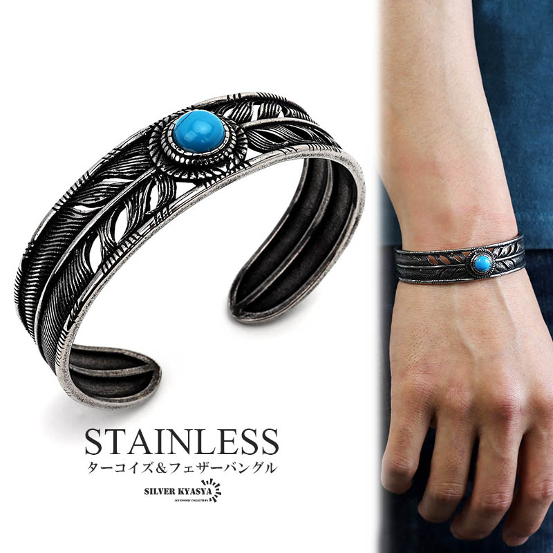 ステンレス素材 ターコイズ付き ダブルフェザーバングル シルバー 太めバングル 羽根バングル ブレスレット シルバー