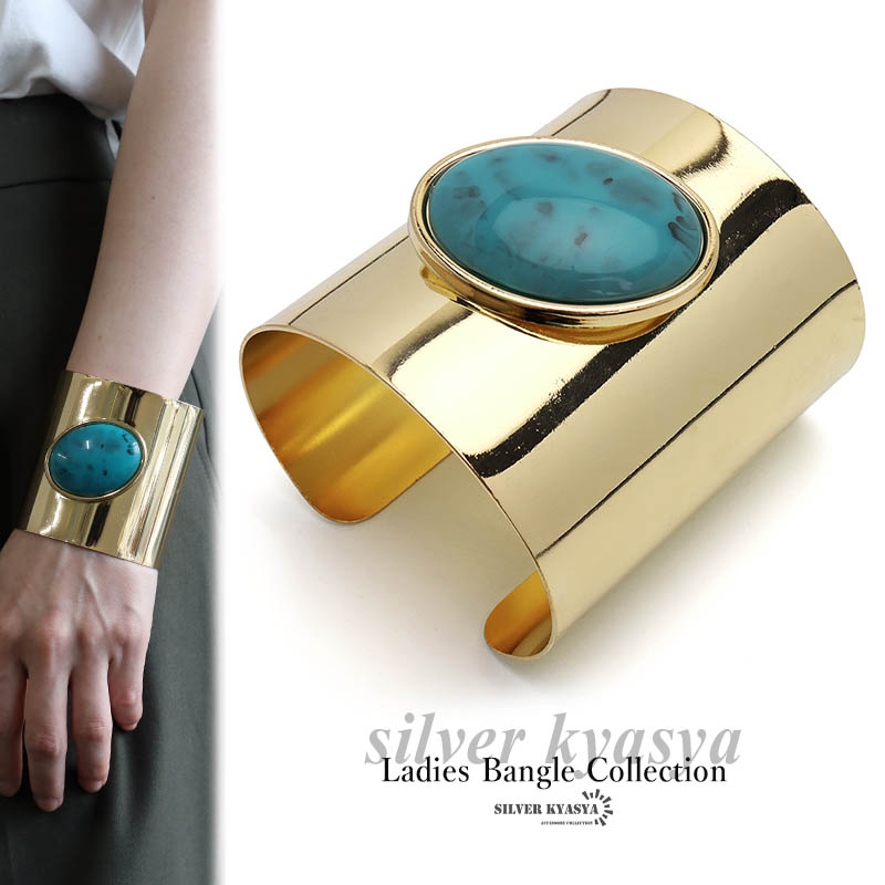 大粒ターコイズブルー ワイドバングル 一粒バングル ゴールド 樹脂 ストーン 腕輪 ごつめ 太め 幅広 存在感