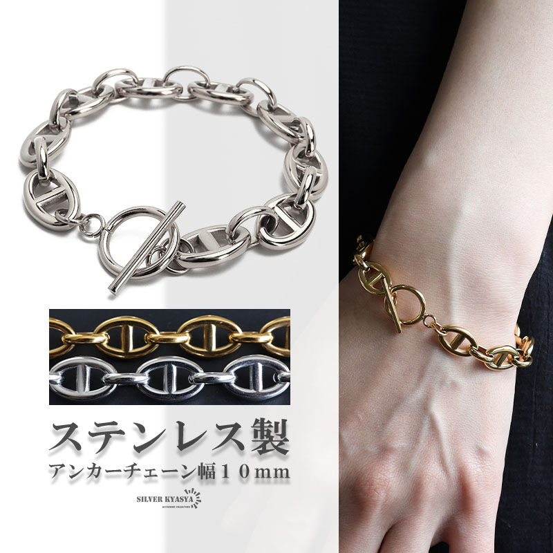 ステンレス アンカーチェーンブレスレット マンテルブレスレット 10mm ゴールド シルバー 鎖 錨 金属アレルギー対応