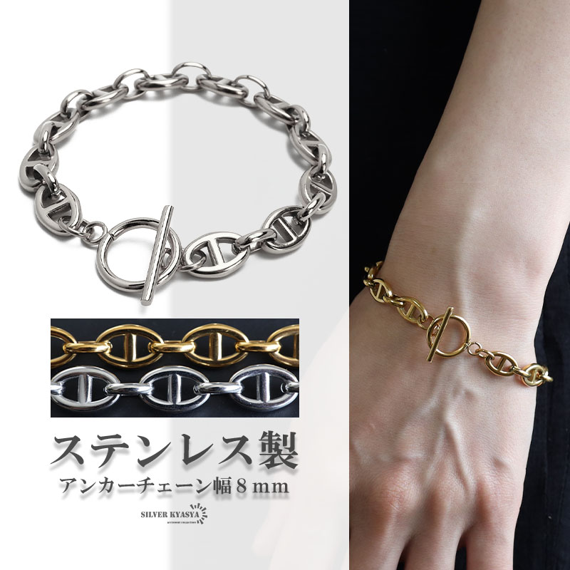 ステンレス アンカーチェーンブレスレット マンテルブレスレット 8mm ゴールド シルバー 鎖 錨 金属アレルギー対応