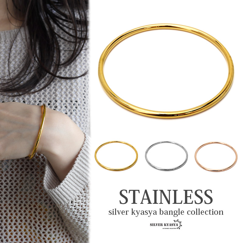 ステンレスを使用したシンプルバングル。高品質、高性能、メッキも剥がれにくいバングルで付けっぱなしもOK!オールシーズン使えるマストアイテム。