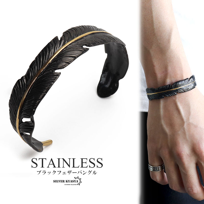 ステンレス素材 ブラック フェザーバングル ゴールドライン ワンポイント羽根バングル ブレスレット