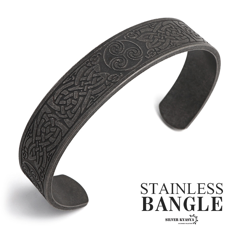 緻密なケルト文様がユニークな印象のステンレス素材を使用したバングル。センターの渦巻きがワンポイント。