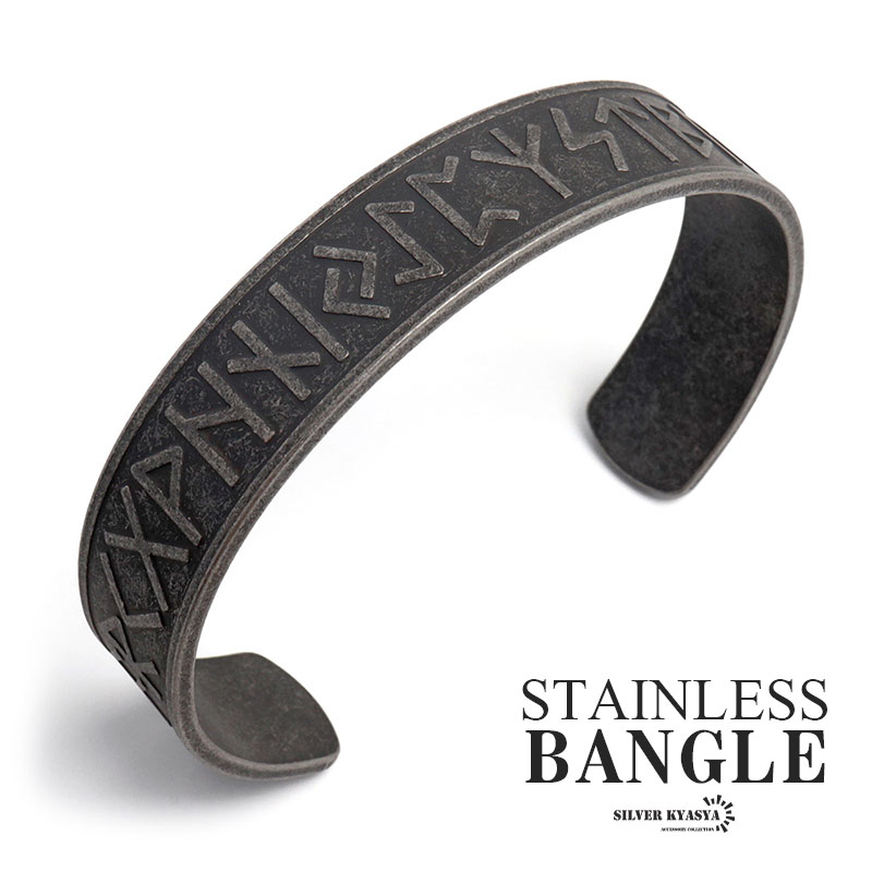 直線的なルーン文字がクールな雰囲気を放つステンレス製バングル。燻し風加工が効いた重厚感抜群のアイテム。