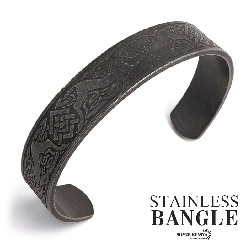 ステンレス ブラック 瑞獣バングル メンズ 平打ちバングル ブレスレット 腕輪 黒 アンティークバングル 金属アレルギー対応