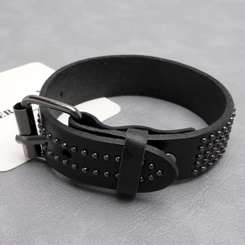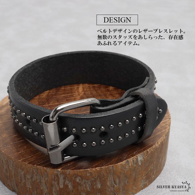 ベルトデザインのレザーブレスレット。無数のスタッズをあしらった、存在感あふれるアイテム。