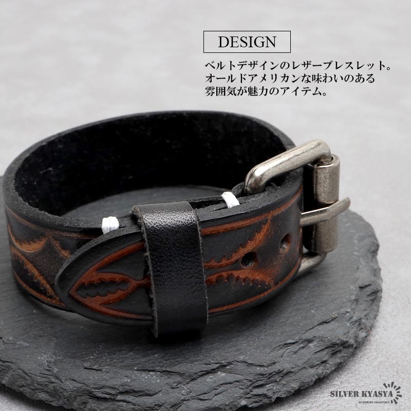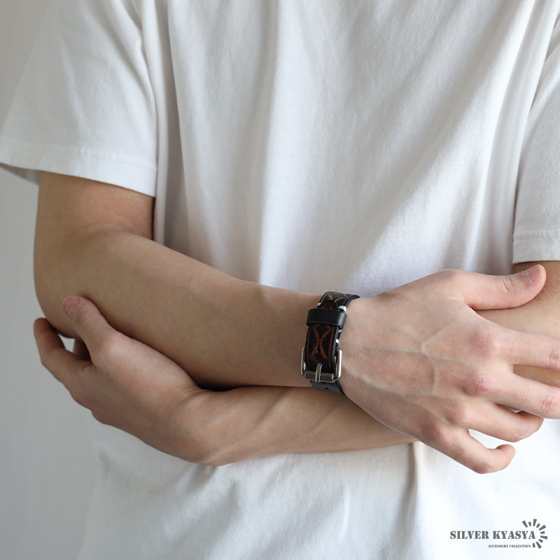 ベルトデザインのレザーブレスレット。オールドアメリカンな味わいのある雰囲気が魅力のアイテム。
