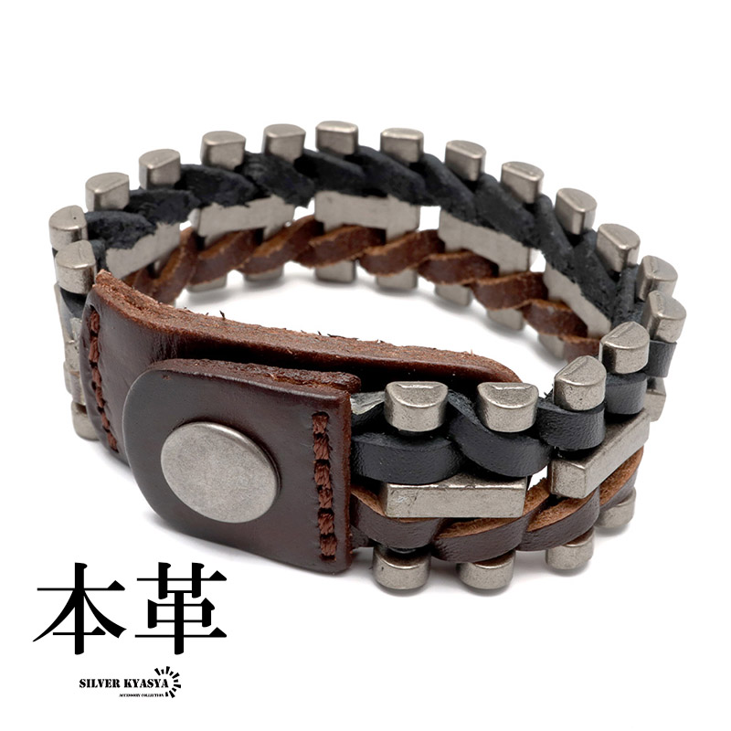 編み込み レザーブレスレット バイクチェーン アメリカン レザーブレスレット 牛 本革 メンズ 腕輪 本革バングル リアルレザー