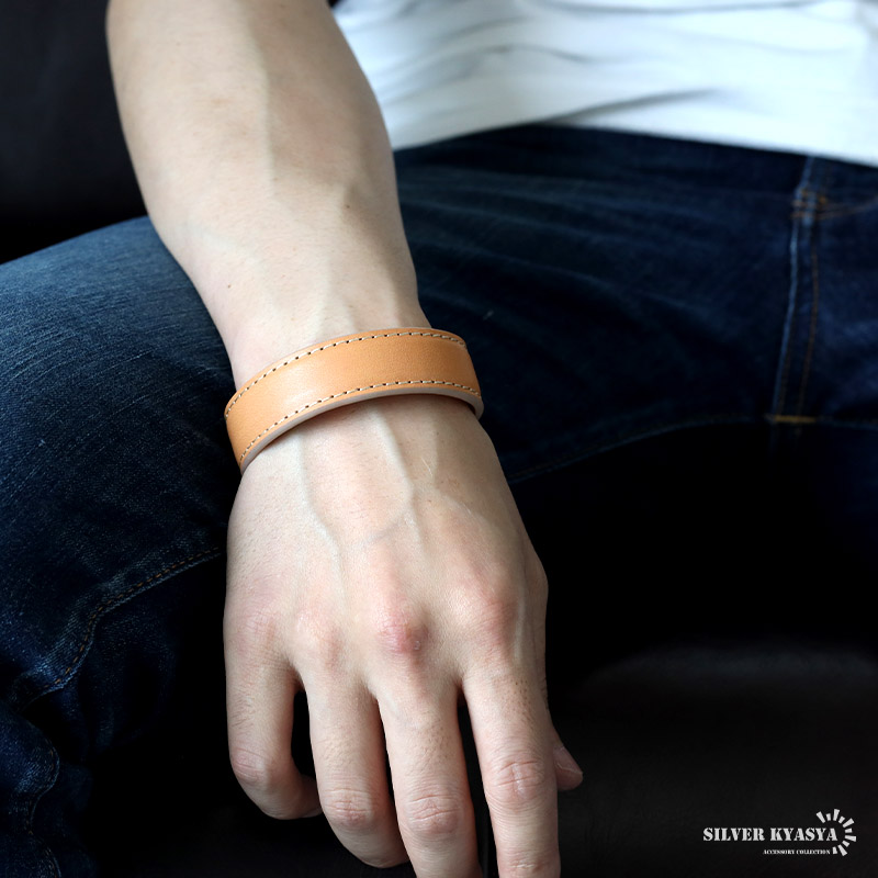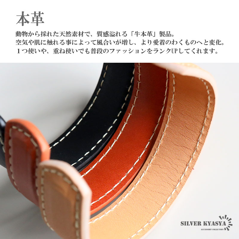 牛革を使用したシンプルなレザーブレスレット。使えば使うほど牛革ならではの味わい深い風合いになります。ブラック/オレンジ/キャメルの全3色。