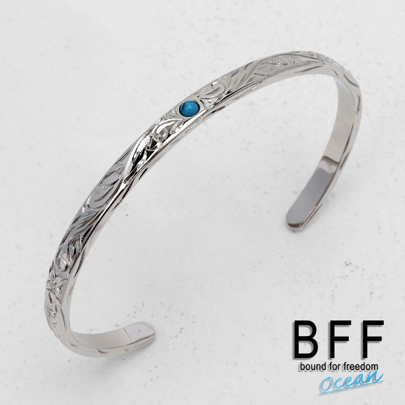 BFF ブランド ハワイアンバングル ターコイズ 幅4mm シルバー 銀色 平打ちバングル 腕輪 細身 メンズ レディース 手掘り