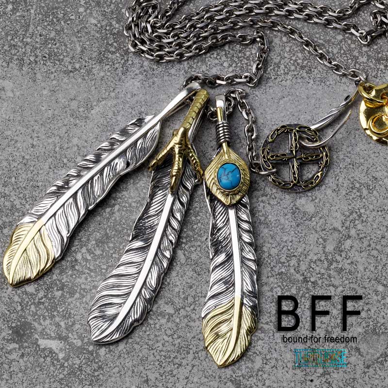 BFF ブランド フェザーネックレス メンズ シルバー925 先金 上金 ツイン 天然石 トルコ石 本革 唐草 専用BOX付属