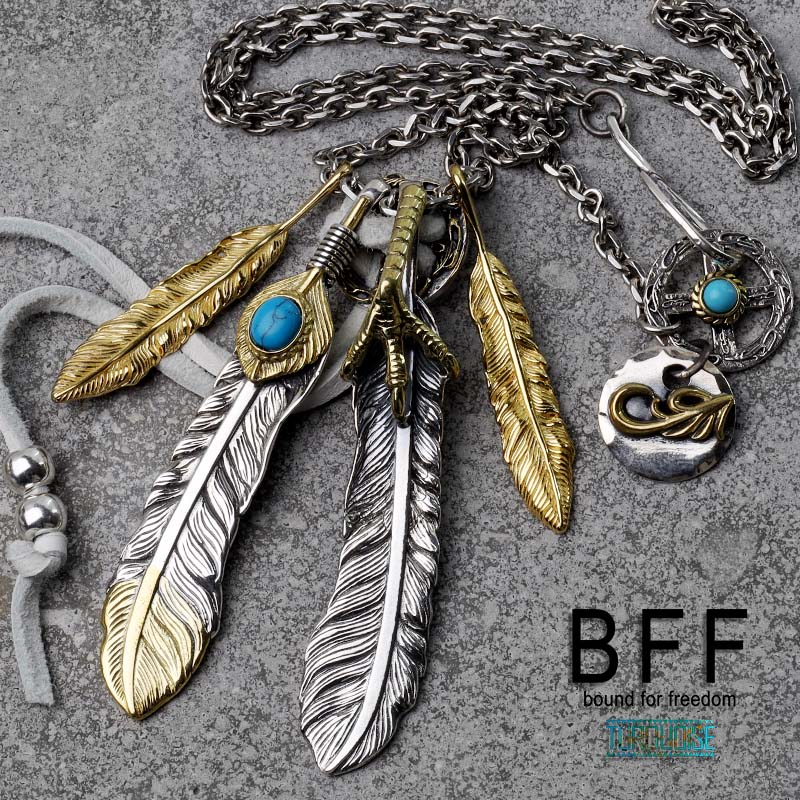 BFF ブランド フェザーネックレス メンズ シルバー925 ゴールド フェザー 4枚 18KGP 唐草 専用BOX付属