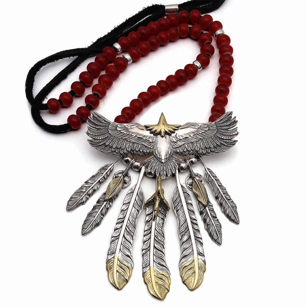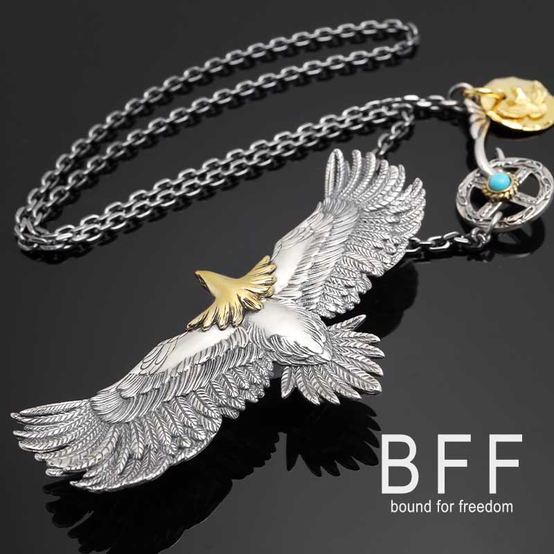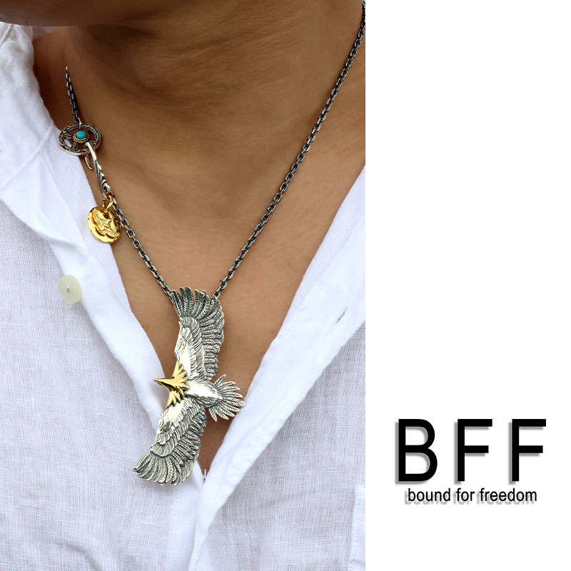 繊細ながらも躍動感のあるイーグルをセットしたBFFオリジナルネックレス。チェーンをフェザーの片翼に通し、他とは一味違ったネイティブスタイルを楽しめるアイテム。