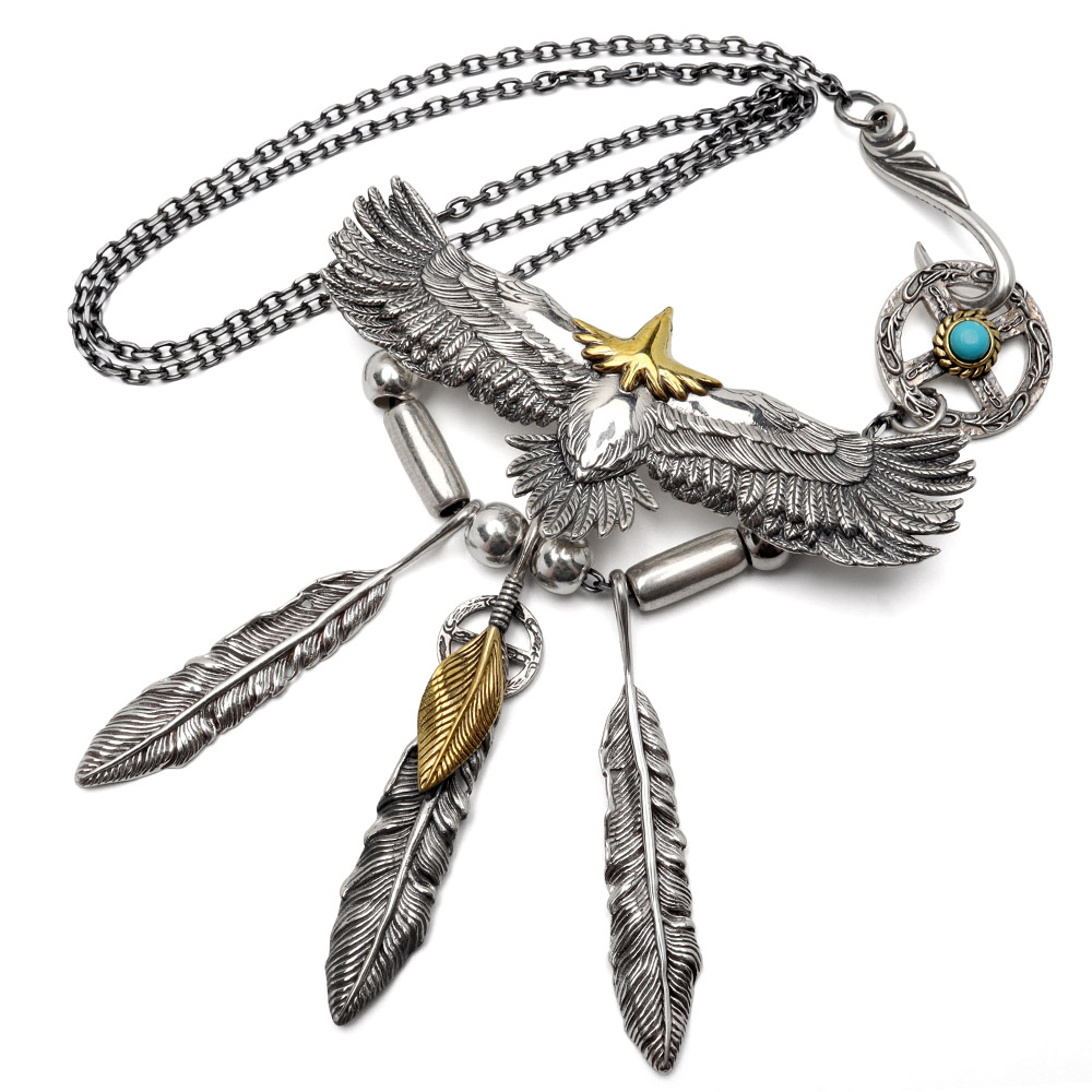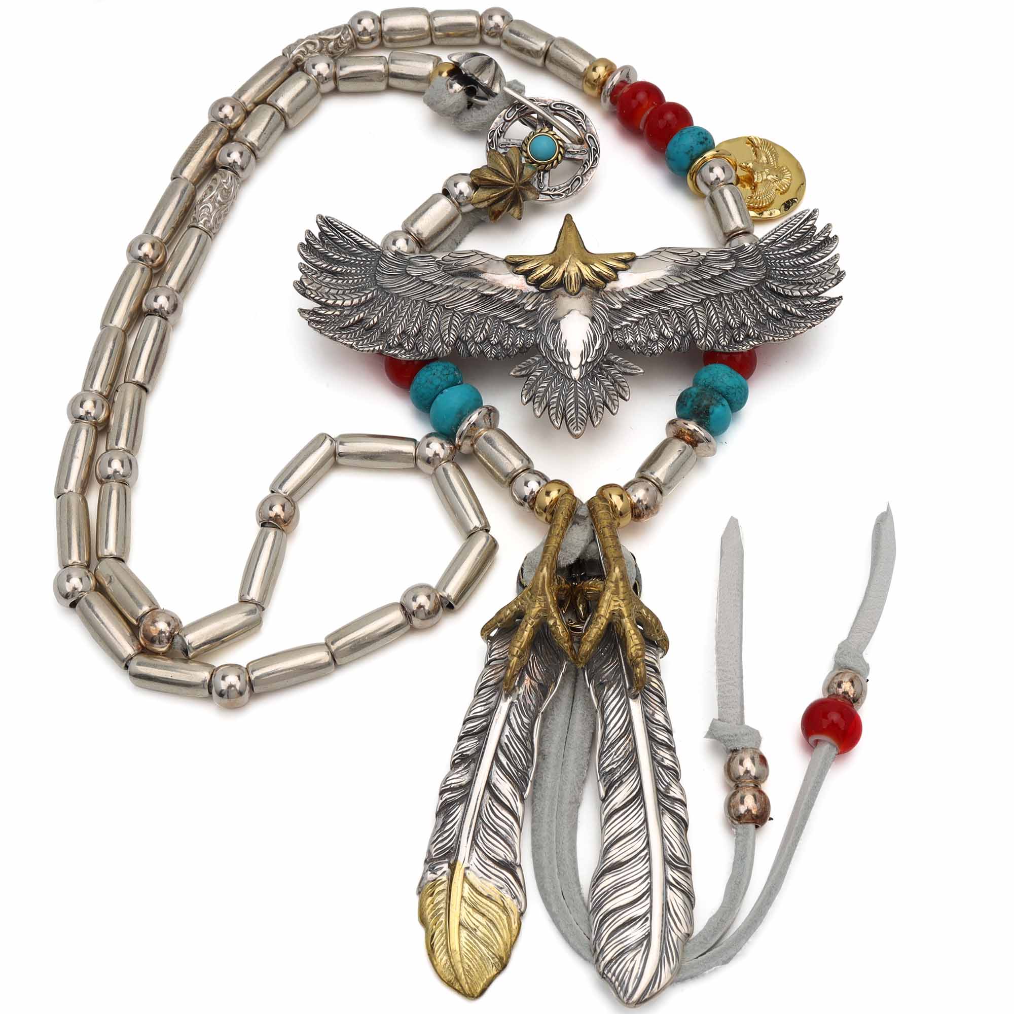 躍動感のあるイーグルをセットしたBFFオリジナルネックレス。チェーンはボリューム感のあるパイプビーズをセット。ワンポイントのフェザービーズが魅力的なアイテム。