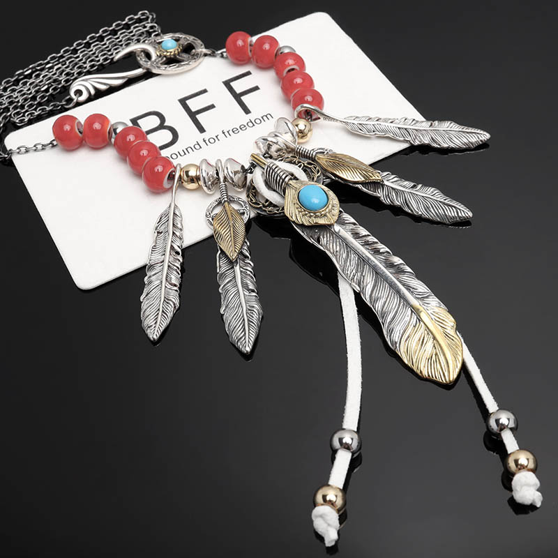 繊細なターコイズフェザーとスモールフェザーを4枚組み合わせたBFFオリジナルネックレス。ホワイトハーツを差し色にセットし、ネイティブスタイルを楽しめるアイテム。