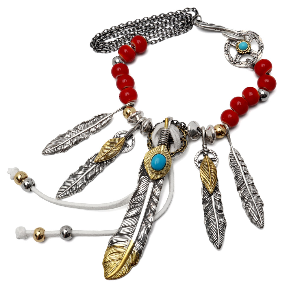 イーグル&フェザー&銀ビーズ&ホイール&フック&チェーン:シルバー925(刻印あり、金色部分は真鍮製、人工ターコイズ)